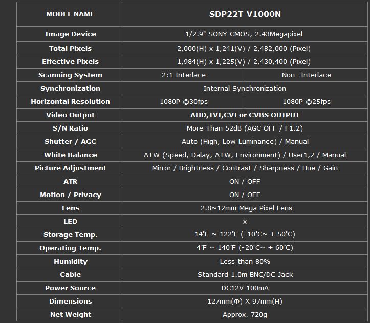 • 1/2.9' SONY CMOS 2.48M Sensor