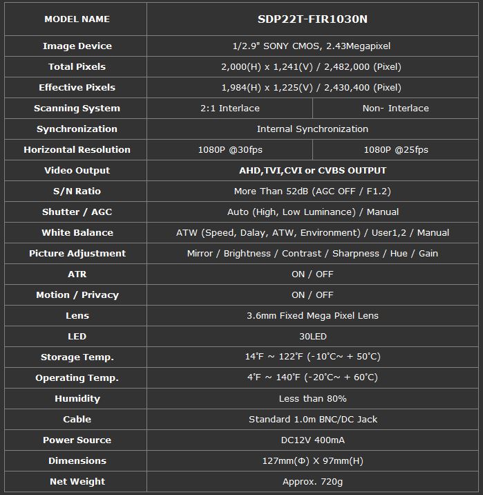 • 1/2.9" SONY CMOS 2.48M Sensor